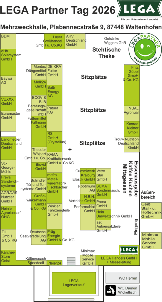 Der LEGA-Partner Tag hat sich mittlerweile zu einer bedeutenden landwirtschaftlichen Ausstellung für das gesamte Allgäu entwickelt. Es ist der Treffpunkt der LEGA-Landwirte und Lieferanten schlechthin. Über 50 LEGA-Partner stellen aus und es werden wieder viele Messeneuheiten dabei sein. Die Messeneuheiten werden im LEGA Messeticker auf www.mylega.de veröffentlicht.